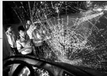 9月9日晚上,长沙市潇湘大道车祸现场,公交车的前挡风玻璃已被完全撞碎。 实习生 李健 摄