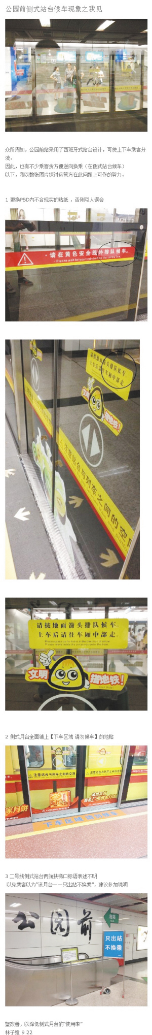 “铁丝”@WAYNE-木木了一纟隹指出,目前公园前站存在的问题主要有三点:一是非上车区域(即下车平台)的屏蔽门也贴有“请在黄色安全线外排队候车”的引导标识;二是地面标志不全面,仅在一号线下车换乘二号线的平台上,地面贴有“下车区域 请勿候车”的字样,而在二号线换乘一号线时,平台仅有箭头标注;三是二号线侧式站台两端扶梯口标语表述不明,“只出站不换乘”会引起误会,以为该月台只能出站而不能换乘。