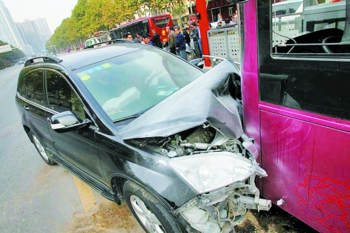 昨天下午2时20分,记者赶至郑州市桐柏路快速公交棉纺路站看到,一辆B1公交车头朝北停在站点处,一辆黑色豫A牌照的本田CRV车与公交车顶头撞在一起。它的引擎盖损坏严重,驾驶室、副驾驶位置安全气囊打开。两车北侧,马路中央的护栏损坏六七米,地面难寻刹车痕迹。在现场,多人合力将本田CRV车从B1快速公交车头处推出,交警二大队事故拖车将其拖走。