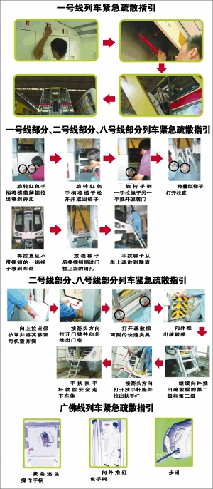 1.一号线、二号线、八号线、广佛线的列车两端驾驶室设有紧急疏散装置(门),紧急情况下,需通过司机室的应急通道门进行疏散。乘客按照工作人员的指引通过此装置,进入轨道,步行到就近车站。
