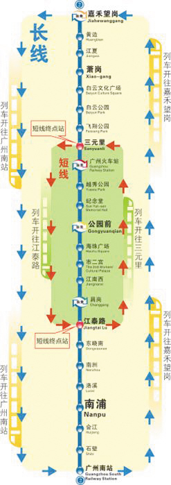 由于二号线在早高峰临时设置中间终点站江泰路站和三元里站,因此,在这两个站上下车的乘客要留意。相关负责人解释,遇上短线车开至江泰路或者三元里后,即使是长线乘客也要下车,下车的时候要迅速,落客完毕列车马上退出服务。在站台候车的乘客要留意站台广播和到站显示屏提醒乘客“请勿上车”的信息,不要进入列车,应留在站台等候下一趟列车,避免列车不能按时退出延误运营。