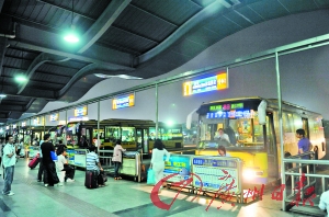 东莞汽车总站,跨镇公交车在等待发车。