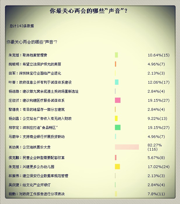 2013年深圳“两会”期间,网友们最关心什么?深圳新闻网“圳调查”选取16位人大代表、政协委员的声音邀请网友票选,结果显示,人大代表肖幼美提出的“公交地铁票价太贵”项受到了超过8成网友的关注,远远高于其他选项。