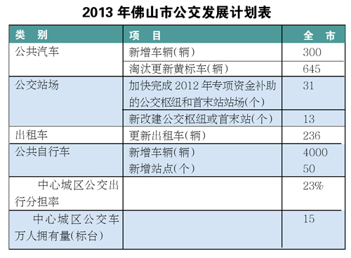 本报讯 (文/表 记者李传智 通讯员罗响)佛山市交通部门昨日正式发布《2013年公交提升计划》(以下简称《计划》),计划在今年全市淘汰更新黄标公交645辆,新增公交车300辆,新增公共自行车4000辆,更新出租车236辆,年底前城区(佛山中心城区、大良、荷城、西南)公交分担率达23%,城区万人拥有公交车达15标台。此外,佛山还将积极向交通运输部申报全国“公交都市”建设示范的试点城市,争取交通运输部更多的支持,加速佛山公共交通事业的发展。
