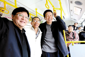 “市长,我们来个合影。”在117路公交车上,64岁的退休老人杨湛幸(左二)高兴地拿出手机,让禅城区区长刘东豪帮他与刘悦伦市长(左三)和许国副市长(左一)合影。/佛山日报记者甘建华摄