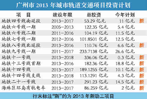 广州今年将投资123.6亿元用于轨道交通建设。其中,今年新动工项目包括地铁四号线南延段、地铁八号线北延段、地铁十一号线、地铁十三号线首期、地铁十四号线、地铁十四号线支线、地铁二十一号线,海珠区环岛有轨电车等8条线路。
