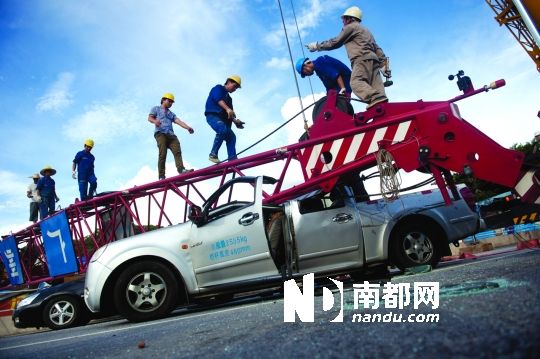 被砸中的黑色广本轿车车主侯先生是唯一幸免于伤的乘客,“起重吊臂砸下时,车子突然向上弹了一下,然后落下来,自动位移了一段距离才停下来”。走出小车,侯先生只是有点发晕,身体并无大碍。