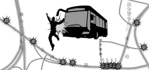 过了黄涌村路段,肇事公交车依旧疯狂前行,在加油站正前方的机动车道刮倒一人,伤者由治安队员报警送到医院。