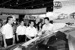广东省副省长刘志庚在比亚迪的展位了解电动出租车和客车的情况。