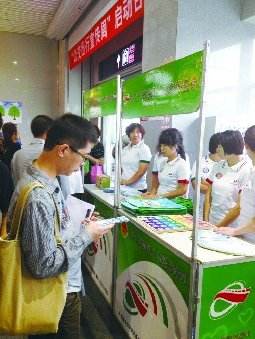 9月16日一早,北京市民小周在四惠公交枢纽发现,枢纽大厅和平时有些不一样。不少人围在换乘长廊的通道口,饶有兴趣地翻看公交优先出行宣传资料,志愿者们为路过的乘客认真解答绿色出行的相关问题(见图)……