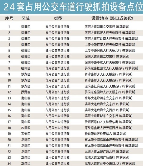 为进一步保障“公交优先”,市公安局交警局今日起启用了24套占用公交车道行驶抓拍设备,涵盖了福田、罗湖、南山、盐田、宝安、龙岗6个区,查处高峰期占用公交车道行驶交通违法行为。