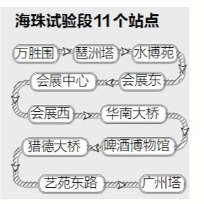 广州新型有轨电车海珠试验段起于万胜围站,止于广州塔站,线路全长约7.7公里,共设置11座车站。最先启动建设的工程位于新港东路路段(万胜围站至琶洲塔站),长约1.2公里,拟分成两段施工,第一段施工争取于2014年春节前完成。