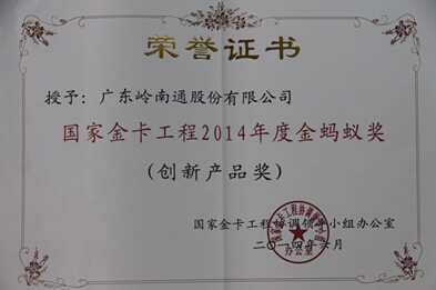 2014年6月,岭南通公司“粤港澳交通一卡通多场景化安全支付核心模块终端”获得国家金卡工程2014年度金蚂蚁奖创新产品奖,这是岭南通公司连续2年荣获该奖项。