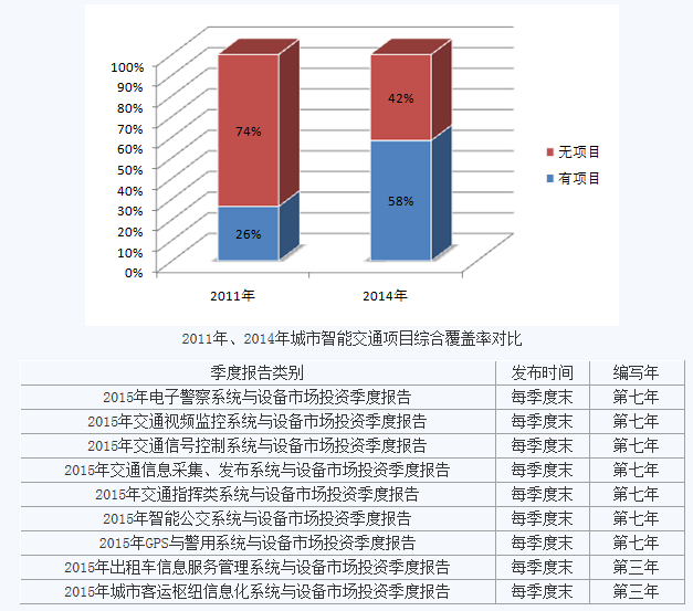 从2011年、2014年城市智能交通项目综合覆盖率对比结果看,2014年有城市智能交通项目投资的城市较2011年翻一倍,智能交通建设需求迅速增加,但仍有42%的城市仍处于待开发建设状态。
