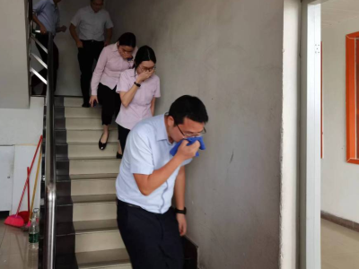 活动第一部分是模拟办公场所突然发生火灾险情,现场人员利用湿毛巾等捂住口鼻,迅速有序撤离到大沥车站后场,距离着火点最近的人员利用灭火器将明火扑灭和现场戒备,同时安排专人到后场清点人数,现场负责人报告处置情况。