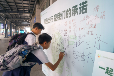 图为市民在绿色出行承诺墙签名