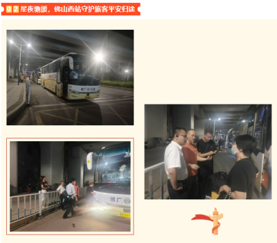 随着台风逼近,由于常规公交停运,佛山西站部分夜间到站旅客疏运压力增大。佛广集团恒通分公司党支部提前部署,召开防御台风专项会议,党员团员带头清理站场、检查物资,做好应急准备。23日晚,恒通分公司接到南海区交通运输局紧急任务,恒通分公司党员干部带领8名应急保障车长驾驶应急疏运车辆赶赴佛山西站转运滞留的旅客。疏运现场,党员干部有序指挥,主动提供引导和搬运行李等服务,最终将157名旅客安全送达各镇街。有旅客感慨道:“看到你们,我就安心了。”一线车长们风雨无阻、尽职尽责,以高度的责任心与专业的服务赢得了旅客们的广泛称赞。24日凌晨,转运任务顺利完成,充分展现了佛广集团党员职工在关键时刻站得出、顶得上的先锋形象。