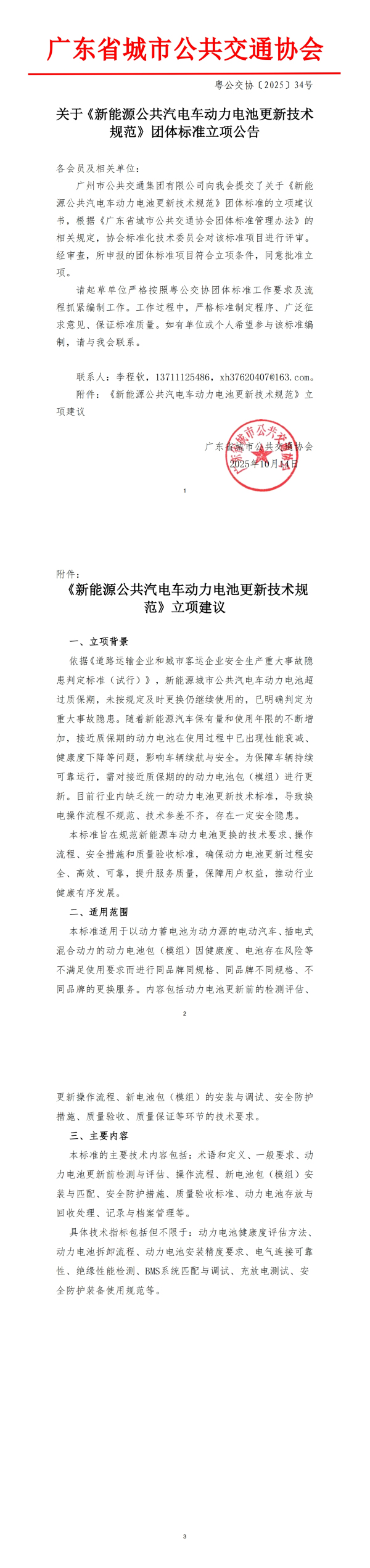 关于《新能源公共汽电车动力电池更新技术规范》团体标准立项公告