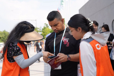 图组为:滴滴出行志愿者及工作人员为外国展商介绍英文版打车流程