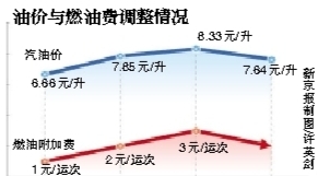 2009年11月,北京完善了出租车租价油价联动机制。当油价在6.50元/升-7.10元/升时,对乘距超过基价公里乘客加收1元/运次燃油附加费。一旦油价低于7.1元/升时,燃油附加费标准相应下调。按照联动机制,当油价跌回6.50元/升-7.10元/升的区间时,燃油附加费降回1元/运次;当油价跌至6.50元/升以下,取消燃油附加费。