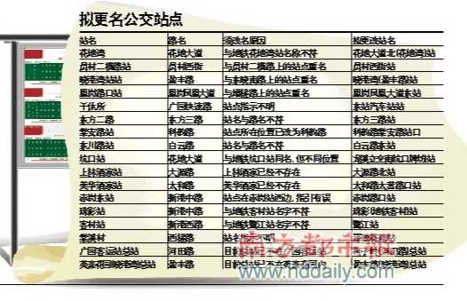 市交委表示,根据《广州市公交站点名称管理办法》的有关规定,市交通部门结合前期摸查和对市民意见收集情况,初步提出了花地湾站等17对站点变更站名的意向(见附表)。市交委现就更名广泛征询市民意见。