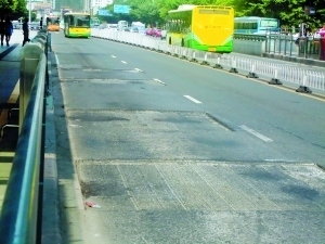 (记者 张建林 实习生 伍立基) “BRT公交车道路怎么沿线都坑坑洼洼,是不是道路下陷了呢?”日前,有市民向记者反映,近来他们在搭乘BRT公交车时感到汽车每走一段路都会特别颠簸,认真查看后才发现,原来是路面上出现了许多约两平方米的大坑。记者向BRT运营公司了解到,原来这些大坑是因为道路沥青经暴晒后出现了爆裂,工作人员正对道路进行保养工作。