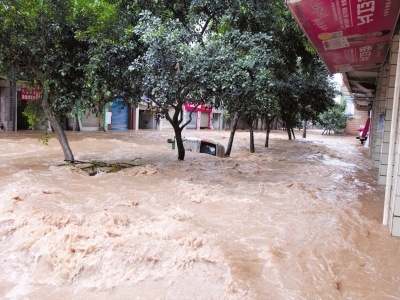 街道上湍急的洪水。江龙摄