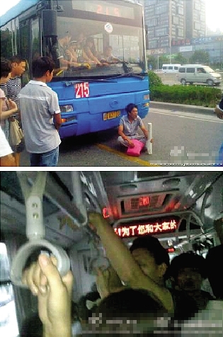 前天下午6时32分,网友“jessie_521”发微博称:“下午6时20分中州大道郑汴路附近,男子因挤不上公交,气愤(地)席地而坐要求司机道歉。”(如图)