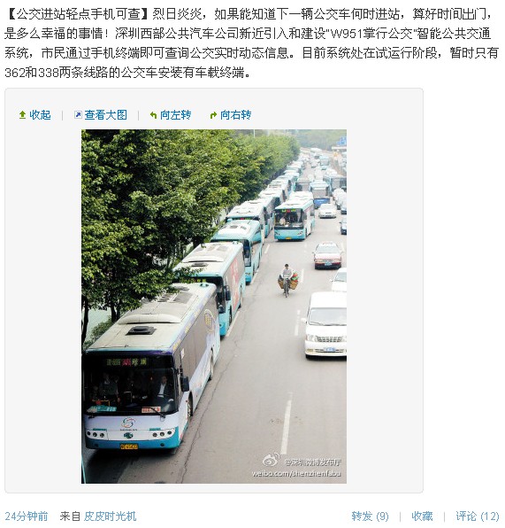 来自@深圳微博发布厅的消息,烈日炎炎,如果能知道下一辆公交车何时进站,算好时间出门,是多么幸福的事情!深圳西部公共汽车公司新近引入和建设“W951掌行公交”智能公共交通系统,市民通过手机终端即可查询公交实时动态信息。目前系统处在试运行阶段,暂时只有362和338两条线路的公交车安装有车载终端。