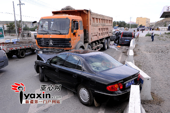 一辆拉运沙子的大货车由南向北行驶至仓房沟路3路车终点站时,大货车刹车不及先后与一辆3路公交车相撞,然后驶入对向车道,将两辆轿车和一辆拉运牛奶的面包车撞坏。图/记者 张万德