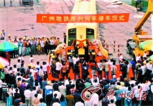 ⑤1997年4月10日,广州市地铁一号线从德国引进的首列列车抵达黄埔港,举行交接仪式。李怀德 摄