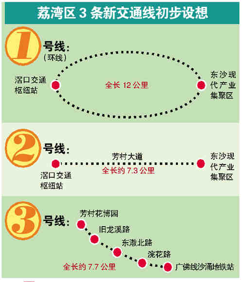 据透露,荔湾区新交通初步规划3条线路,总长27公里。其中:“一号线”充分利用广钢废旧专用线路,线路全长约12公里,起点位于东沙现代产业集聚区,终点位于滘口交通枢纽站;“二号线”线路全长约7.3公里,起点位于东沙现代产业集聚区,沿芳村大道,终点位于滘口交通枢纽站;“三号线”线路全长约7.7公里,起点位于芳村花博园,沿旧龙溪路、东漖北路、浣花路,终点位于广佛线沙涌地铁站。