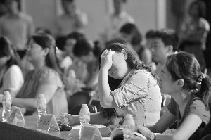 天气炎热,一名记者边擦汗边记录。