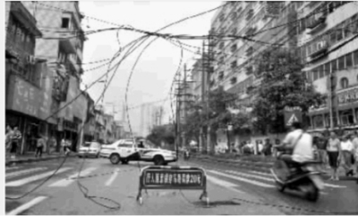 7月15日上午,长沙市蔡锷北路,因电线断落,交警设置了禁行标志,但仍有不少人冒险骑车通过。实习生 李健 摄
