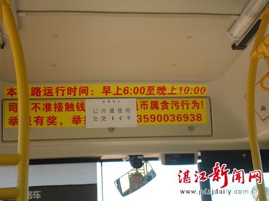 今天早上,许久没坐过公交的笔者,上廉江1路线车时,发现车头上面多贴一张"温馨提示":已开通使用公交IC卡.据司机介绍这公交IC卡也是刚实行一个月,每次刷卡是1.60元,比平时便宜四毛钱,面值有50和100元,这对于经常坐公交的人来说真是好的消息.也改变了廉江没有公交IC卡的历史