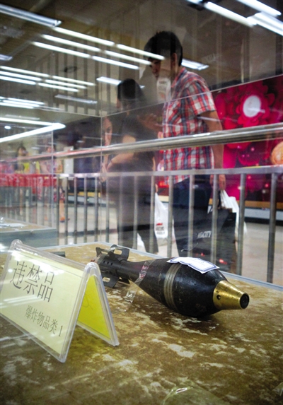昨天,轨道交通安检实物巡回展在地铁王府井站启动,展出的实物触目惊心。一位刚看过实物展品的旅客说:“要没安检,谁还敢坐地铁啊,这么危险的东西都带。”