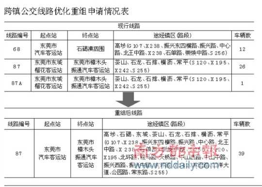 68路、87路、87A路这3条公交线路,拟合并成一条87路公交,线路走向有所调整,但运力总数不受变化,仍为39辆。昨日,东莞市道路运输管理局对《东莞市公共汽车有限公司68路、87路、87A路优化重组申请》的方案进行公示,并征求社会各界意见。公示期为2012年9月11日至2012年9月25日,跨镇公交企业可以在公示期内提交书面意见,如对线路重组申请有异议,请实事求是详细说明理由及依据,如无意见请回复无异议,并于公示日期截止前报东莞市道路运输管理局客运管理科。 公示期限:9月11日至9月25日 联系电话:22002232 传真:22002220
