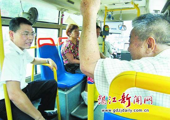 “老同志,常坐这趟车吗,您手里拿的是什么证件?” “常坐,有老年人乘车证,很方便。”“办证方便么?”“方便。”“有人让座位吗?”“有,经常有。”交谈中得知,这位老同志姓陈,家住华盛新城附近,已经80多岁了,是位老湛江,经常乘坐公交车。当王中丙问他城市这几年变化大不大时,陈老伯说:“大啊,现在城市越来越靓了,看病、坐车也都很方便。”