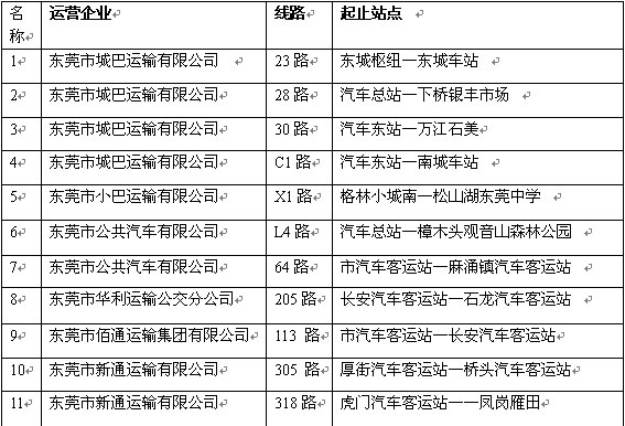 今天下午,东莞市交通运输局发出《关于2012年中秋国庆期间延长我市部分重点公交线路服务时间的通告》,通告称,为加强2012年中秋国庆期间公交保障,满足群众出行需求,经研究,中秋国庆期间延长东莞市部分重点公交线路服务时间:9月30日至10月2日,城巴23、28、30、C1路线、小巴X1路线及跨镇公交64、113、205、305、318、L4路线,末班发班时间统一延长至晚上24:00。11条公交线路纳入其中,包括市区5条线路和6条跨镇公交线路。具体线路情况见表格。