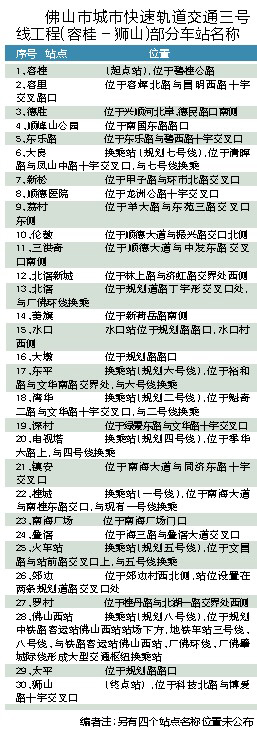 根据获国务院批准的《佛山市城市轨道交通近期建设规划(2011~2018年)》(以下简称《规划》),佛山地铁3号线由容桂至狮山,线路长约70.2公里,设站34座。投资约343.64亿元。原规划的30个站点分别为:容桂、容里、德胜、顺峰山公园、东乐路、大良、新松、顺德医院、荔村、伦教、三洪奇、北滘新城、北滘、美旗、水口、大墩、东平、湾华、深村、电视塔、镇安、桂城、南海广场、叠滘、火车站、郊边、罗村、佛山西站、太平、狮山。佛山日报记者对照相关规划,发现最新的3号线规划在以前的30个站点基础上增加了4个,但具体站名并未透露。