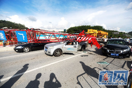 出事的R2线旗峰公园站施工点,位于东莞中路与旗峰路十字路口。三辆被砸的轿车中,靠近工地的黑色广本和银色长城皮卡车受损严重,两车车顶全部被横亘的吊臂压中,车体严重变形。两辆车的司机以及一名乘客受伤,被送往东华医院救治。距离工地最远的另一辆黑色广本受损相对较轻,只有副驾驶位被砸变形,坐在驾驶座上的司机没有受伤。