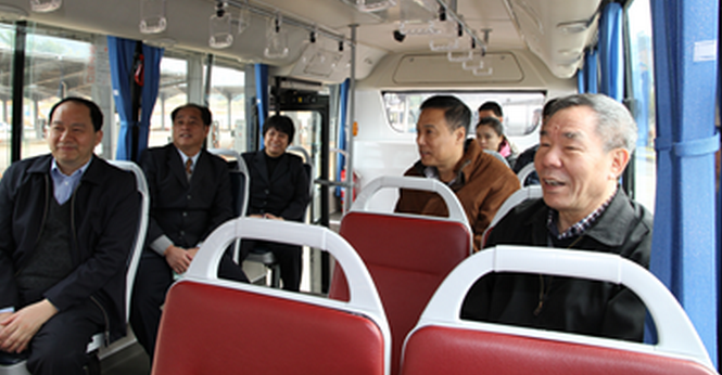 陈自昌会长(右一)、谢文威副局长(左一)、余宝宝董事长(左二)体验纯电动公交车