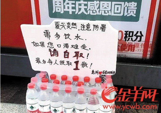 记者马上到市区花边岭广场公交站,看到了报料人所说的免费矿泉水,矿泉水上还有一块牌子,上面写着“天气炎热,注意防暑,需多饮水。如果您口渴难受,请自取,最多每人领取一瓶!”落款为“惠州·有爱的城市”。