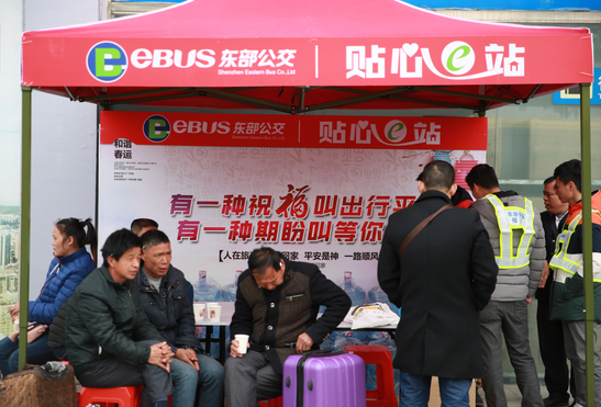 东部公交于2018年2月1日至2月14日、2月19日至3月12日,在各主要火车站设立了“贴心e站”便民服务点,现场东部公交工作人员会为等候的大家提供热水,还有出行指引这样的便民服务,如果有紧急情况工作人员会把便民雨伞和便民药箱提供给大家,“贴心e站”还有一个重要特点那就是:完全免费!