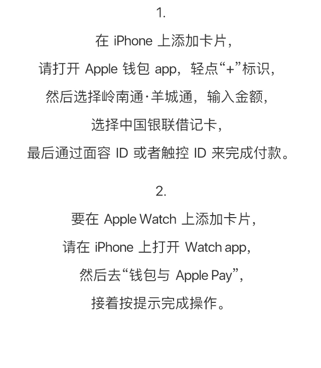 目前,Apple Pay 刷“岭南通·羊城通”可适用于iPhone SE,iPhone 6s,iPhone 6s Plus或更新的机型(软件版本iOS 13.4或更新版本),以及Apple Watch Series 1或更新的机型 (软件版本watchOS 6.2或更新版本)。
