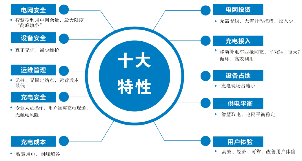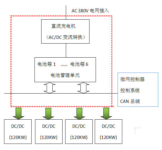 (1) 创新移动充电技术的原理是运用公交底盘及车型作为载体,通过车载动力电池组作为储能装置,安装AC/DC变流转化开关实现由AC380V电网接入转为DC直流储能。再经过储能及充电设备其中包括微网控制系统、CAN总线、DC/DC转化开关,由充电设备可以输出直流电,为纯电动汽车提供充电服务。