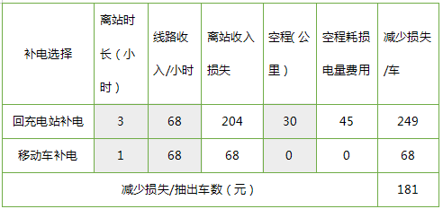 通过上述公式的演算,如果选用创新的移动补电方式,按照广州的平均数据,每台车一天能减少181元的营运收入,一个月能减少5430元,一年能减少65160元。意味着对比用移动技术充电车的充电和选择回到固定充电站场充电,每年每天车能增加收入65160元。