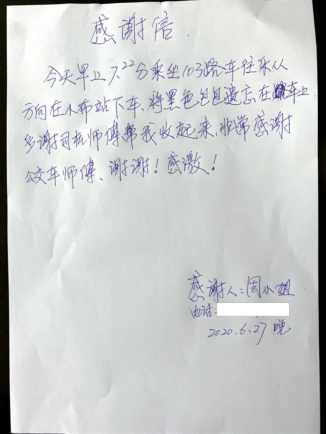 为了再次感谢黄宗坚车长和枢纽站工作人员,周小姐特意写下了一封感谢信以表谢意。