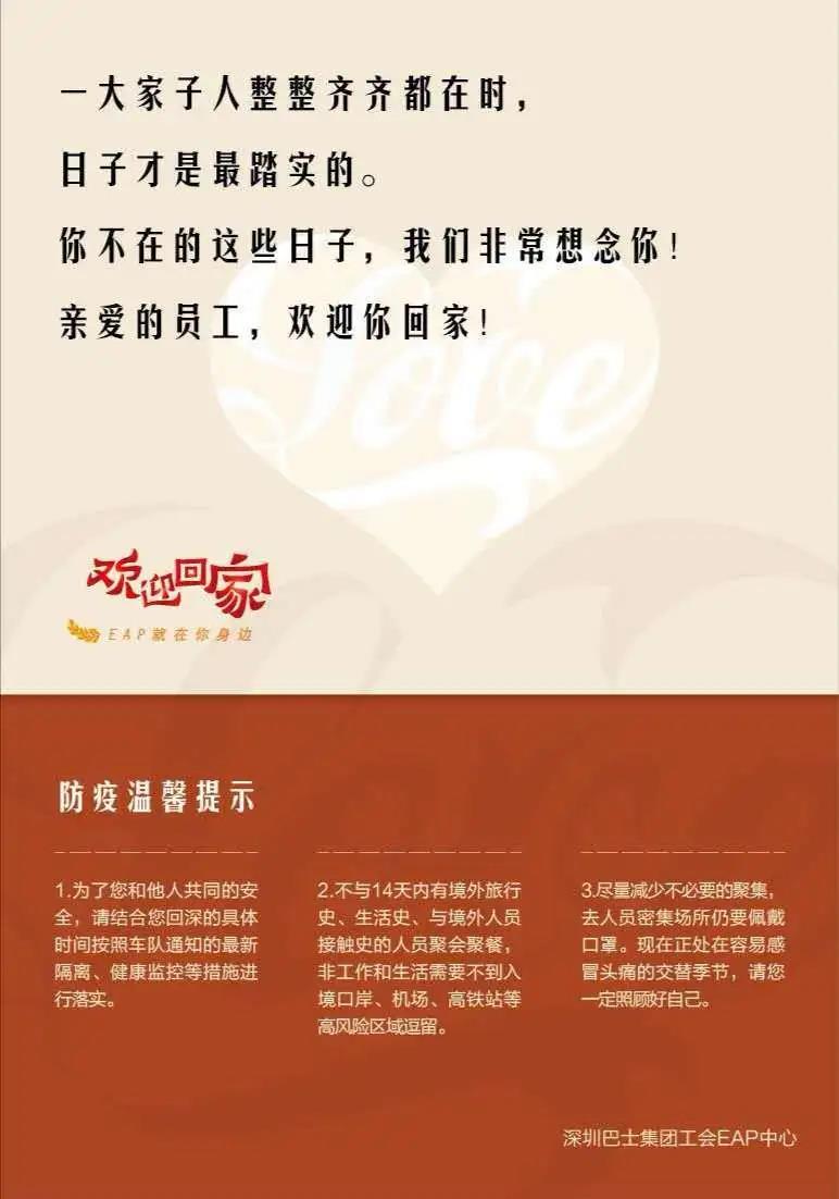 与此同时,巴士集团所有从湖北返深的1149名员工也收到了EAP中心电子心意卡,这是EAP中心特别策划开展的“五个一”助力湖北籍返岗员工情绪疏导、复工适应活动,包括:一张“欢迎回家”心意卡、一份“复工流程”清单、一次岗前谈话、一次岗前培训考评、一次EAP专员主动呼出。