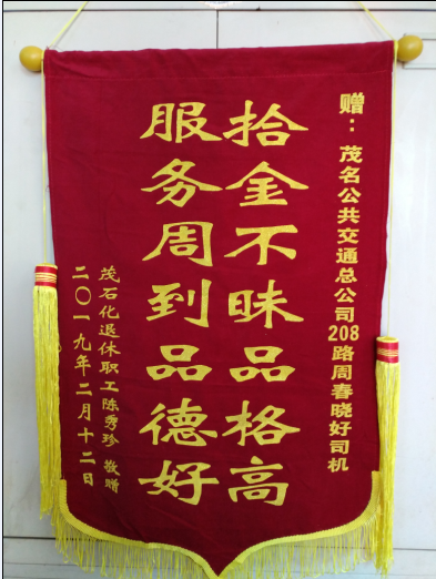 2019年2月初,周春晓驾驶208路公交车到达坡塘村委会终点站,在打扫卫生时发现有乘客遗落了一个背包,打开背包一看,里有5000多元现金。而此时车上只有他一人,车辆也熄了火,正处于无监控状态,周春晓就碰到了这样一道诚信考验题。但,拾到的现金并没有让他起贪念。于是,他根据包里面的身份证信息沿线挨家挨户问,在村民的帮助下,找到了失主陈秀珍女士。